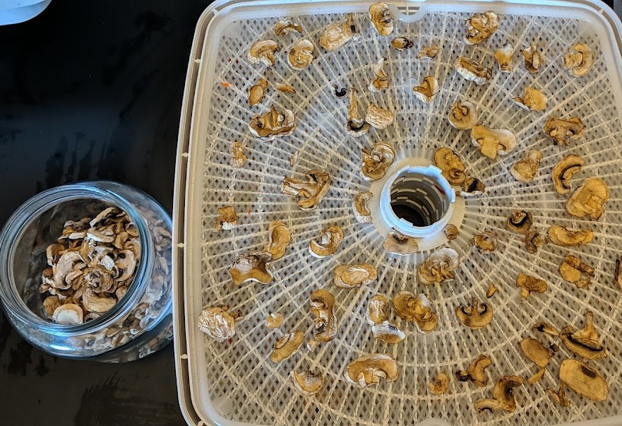 Today’s homesteading task was dehydrating 3# of sliced white button mushrooms for my hurricane supplies. Mushrooms can be rehydrated in soups, stews and to make a lovely Salisbury steak over rice. I’ve got 8 trays going and plan on storing these away in some lovely half gallon jars that I’ve got in my pantry. To dry mushrooms quickly and easily, purchase already sliced mushrooms, give them a nice rinse off, spin out the water and lay them down on trays. Make sure you read your instructional manual to find out the proper temperature to set them at.