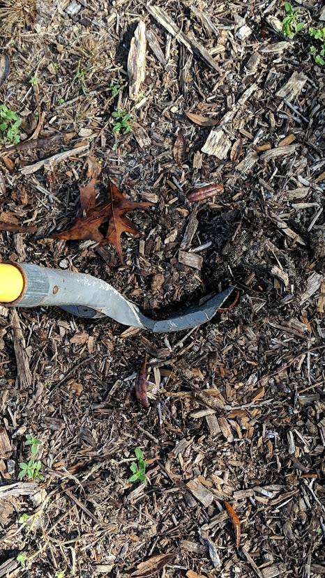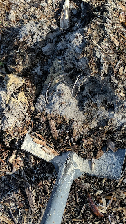 After hacking away at the area where I previously attempted to sink my shovel in, I finally made it through the dirt to expose a small portion of the greyness underneath. Even with the grey dirt exposed, I still couldn’t manage to shove the shovel down to the depth that I managed in the mulched area.