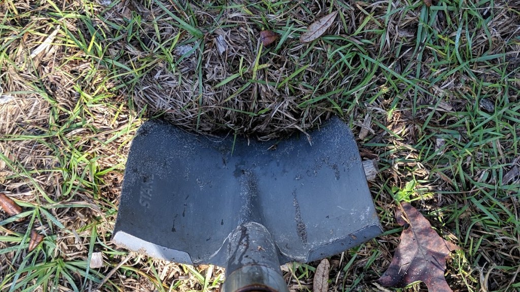 Above is a shot of my attempt to drive our shovel through an area that my husband hasn’t mulched where the shovel barely goes in. The shovel is nicely sharpened, so in theory it should make short work of it.