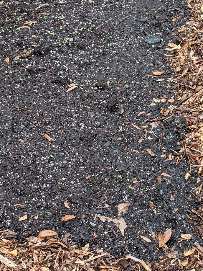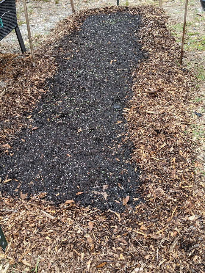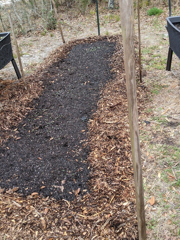 Due to us living in Florida, every year they prepare for hurricane season a few months in advance and go through neighborhoods cutting down any tree branches near power lines. So, we stop them and have them drop a few loads at our home, then I use the mulch as the border for the bed and during the season it will naturally break down and be returned to the soil. I’ll run twine around the poles when the peppers and tomatoes get big enough to need some stability but for now, they are just babies.